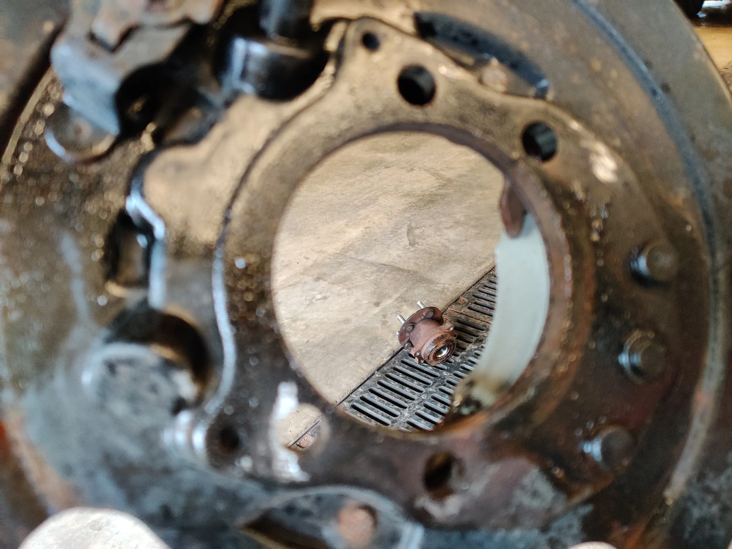 Once the hub begins to come free you most likely will see the backing plate has come with the bearing. Holding the backing plate and hammering in a circle will break the hub bearing free finding it's way to the floor.