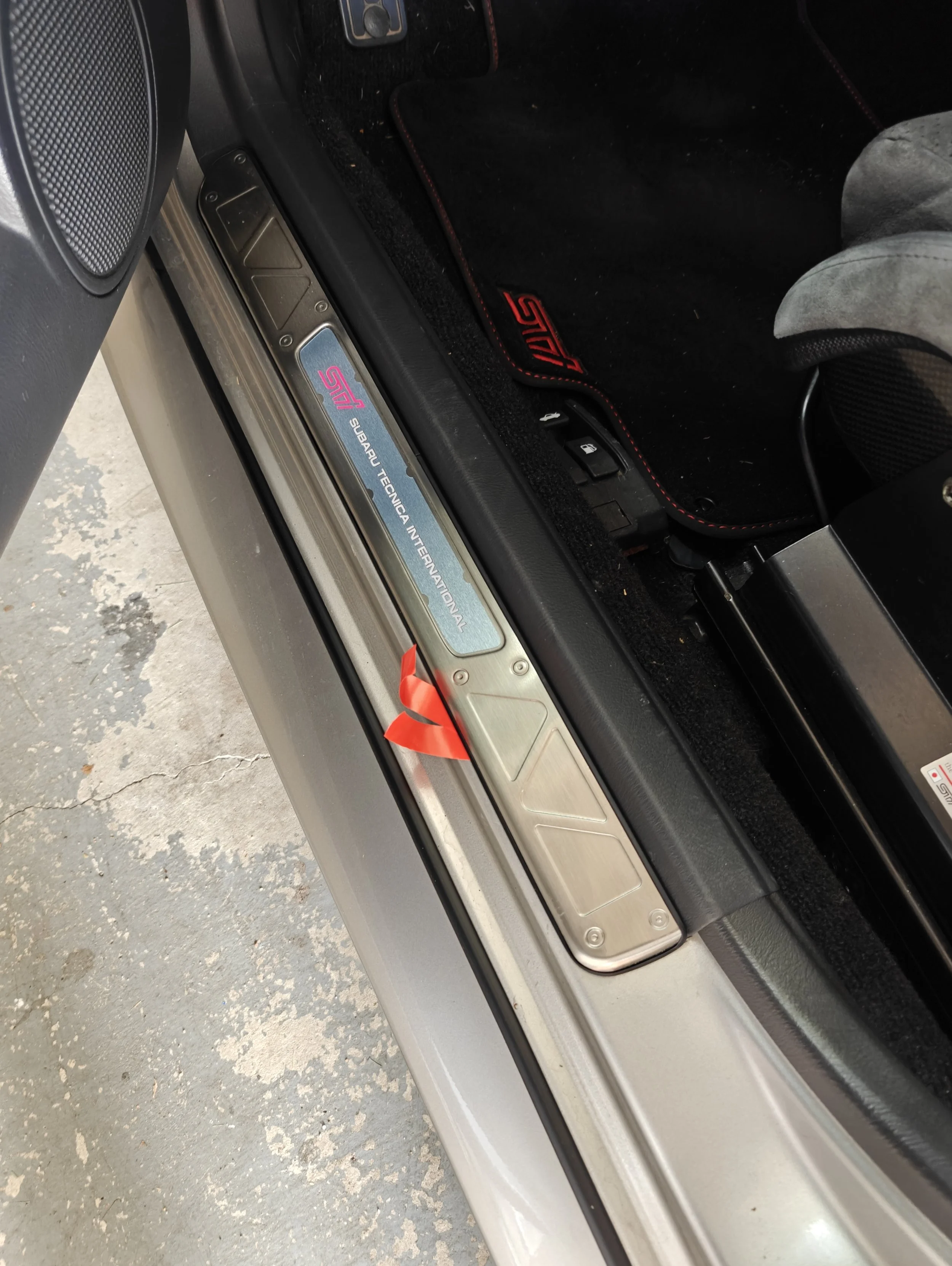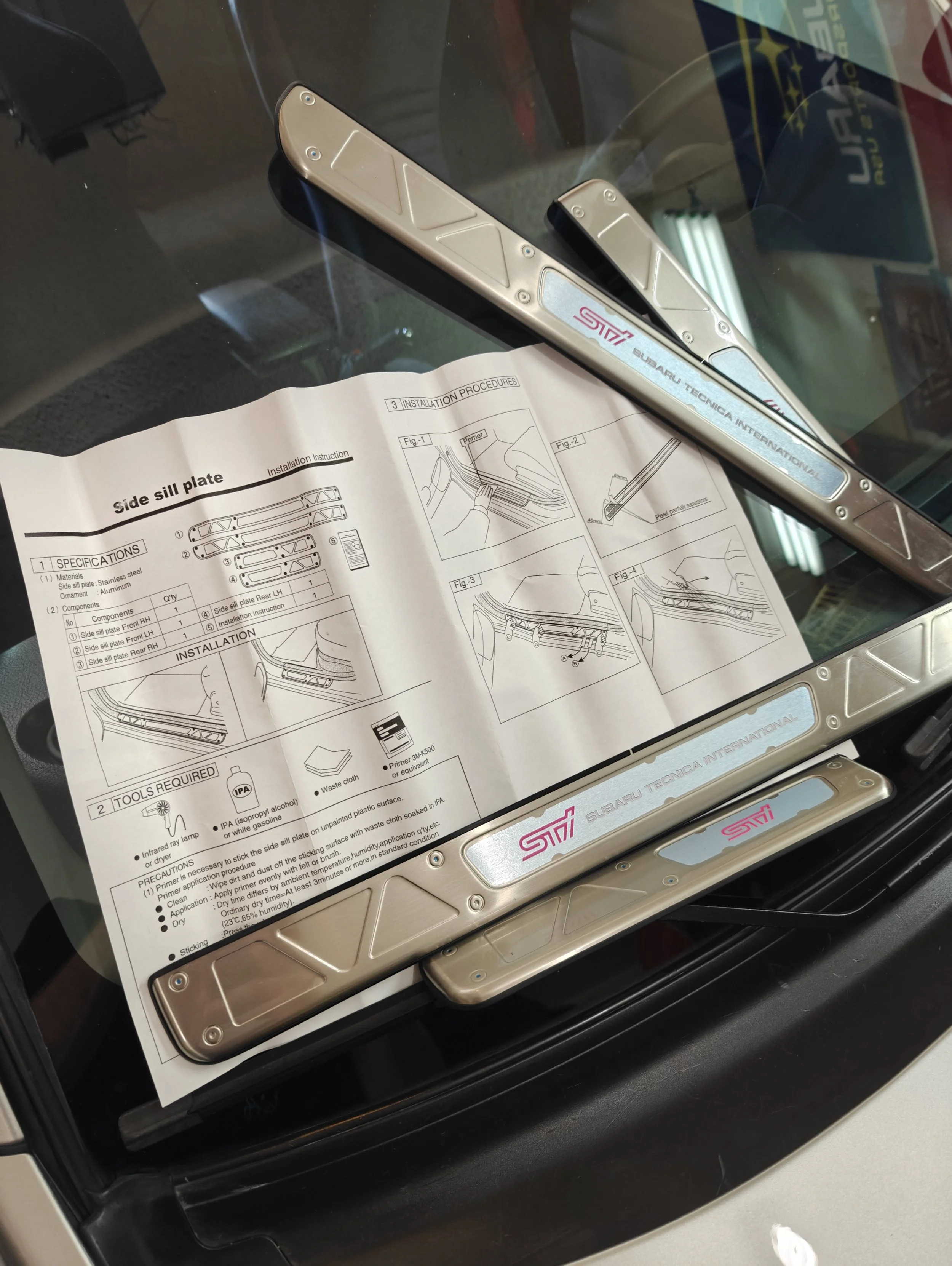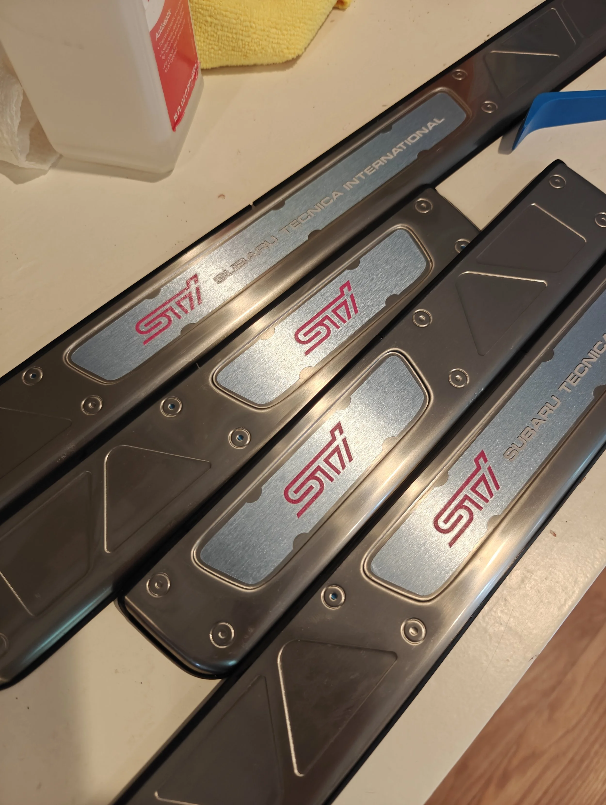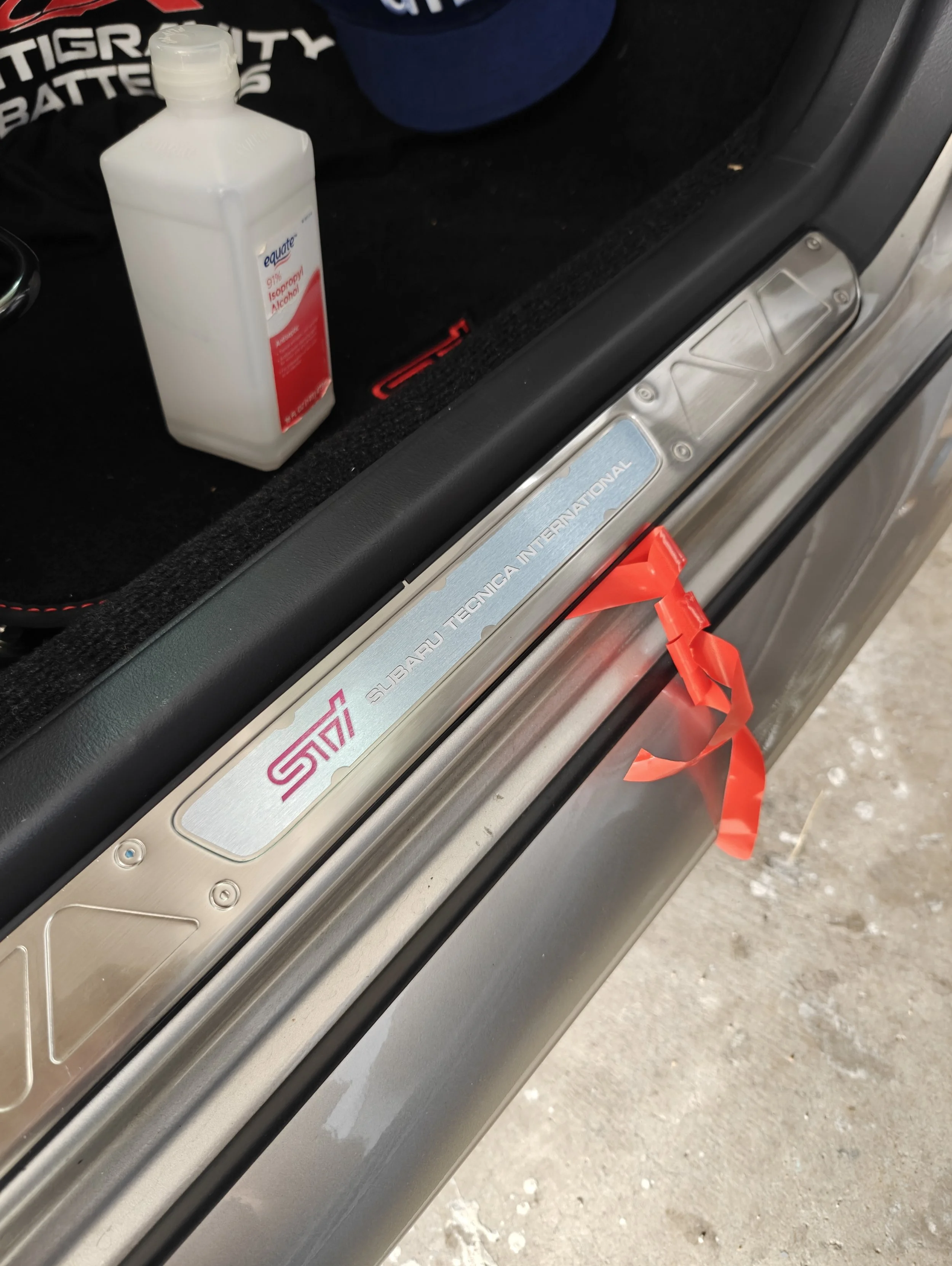I purchased new door sill trims to make these really pop when I placed them on the car. If you are putting them on older trim pieces, I’d recommend to degrease and clean before applying adding your STi door sill plates.
