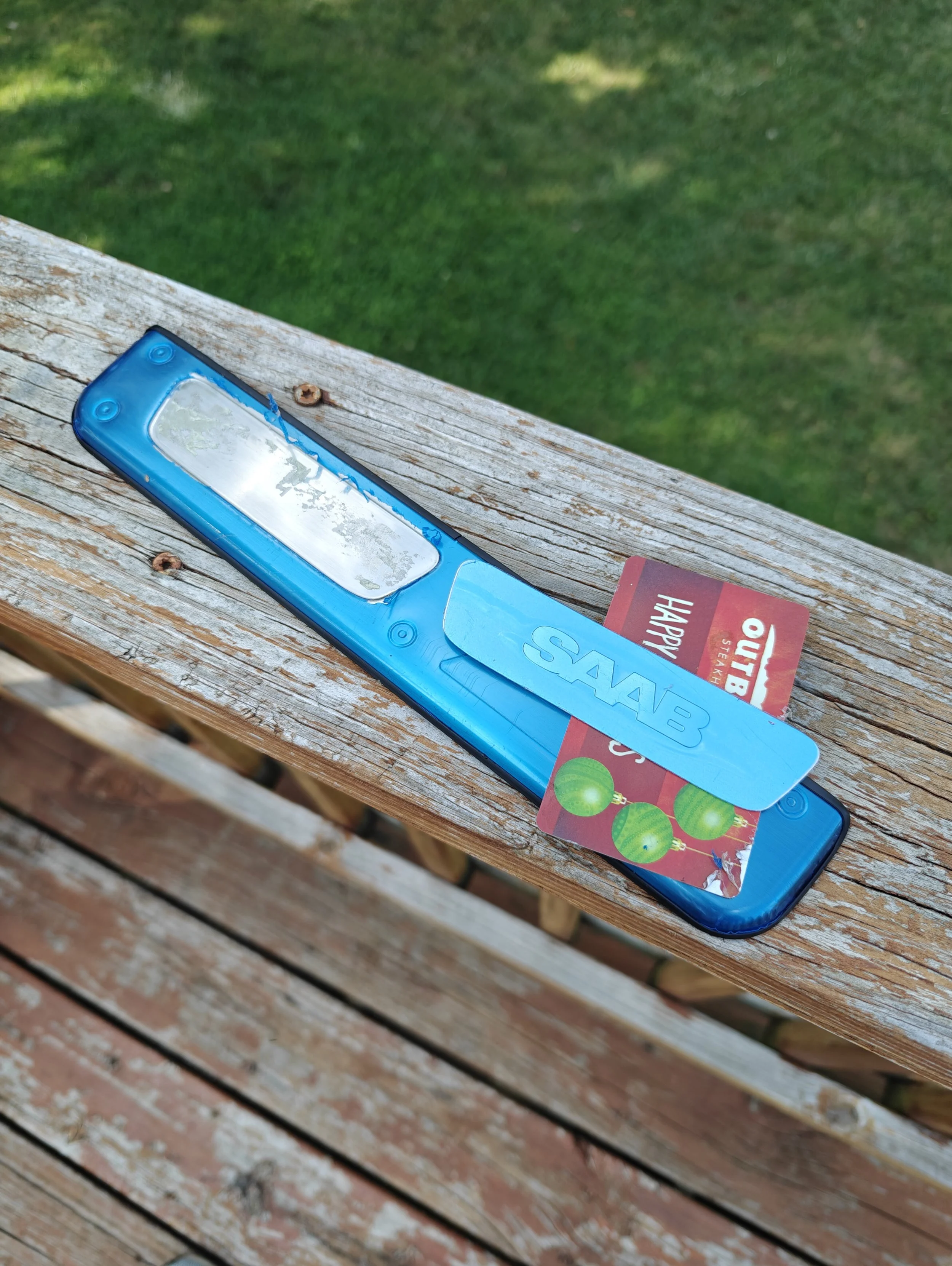 I begun to peel it up the Saab logo with an old gift card and with it peel up you can add a spritz of Goo B gone to help release it. Once applied the Goo B gone I would allow a small amount of time for it set up and break down the adhesive before continuing to peel up the logo. If you want to help expediate the process you can use a larger trim tool to force it off.