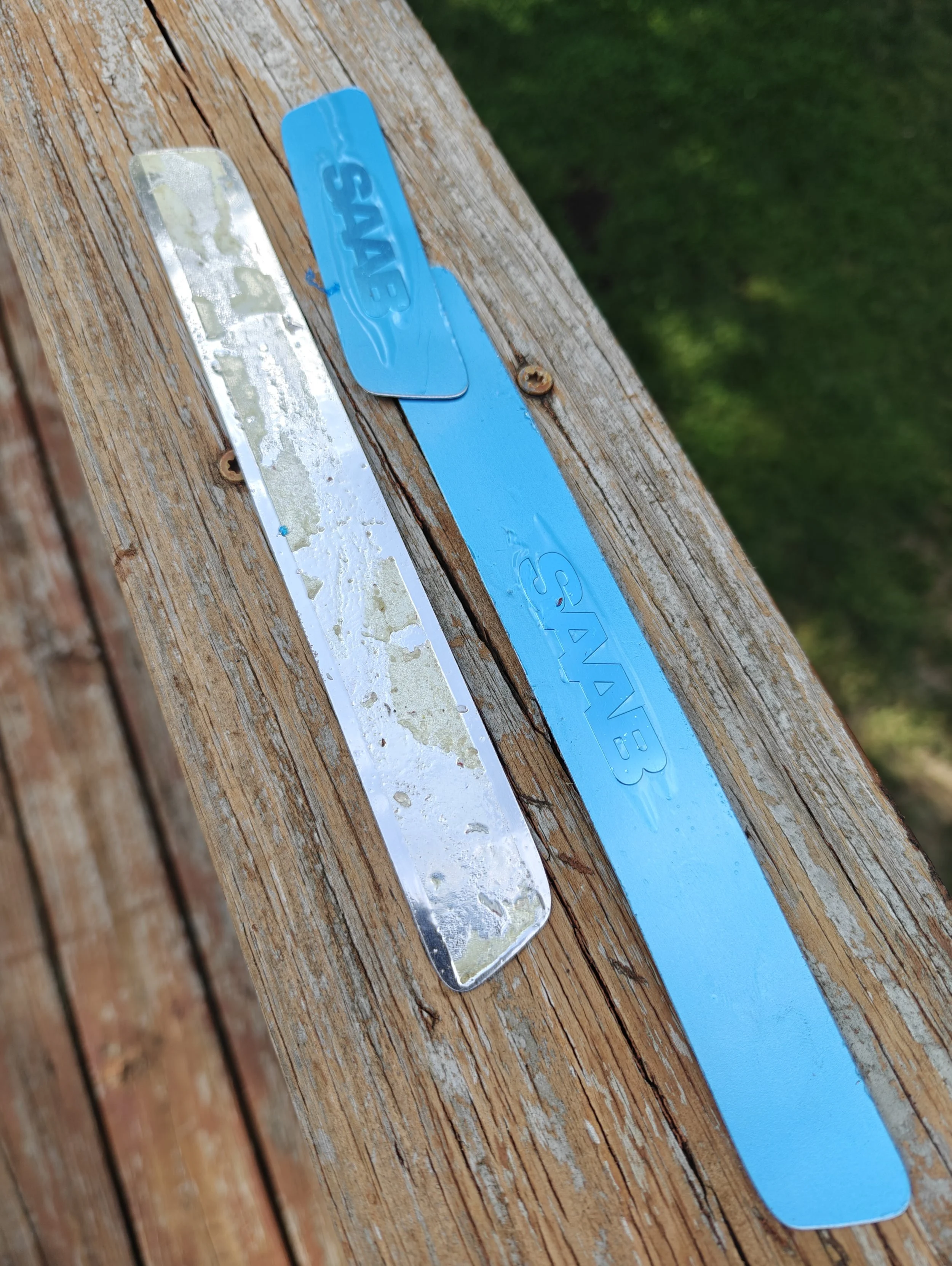 First step is taking the plunge to order sills and be ready to modify them to your liking. Now that you are ok with making it your own let’s begin using a small plastic trim tool to start removing the old logo. My purchased set was from the Saab 92x Aero version. When the Saab logo is removed they won’t be any discernable difference.