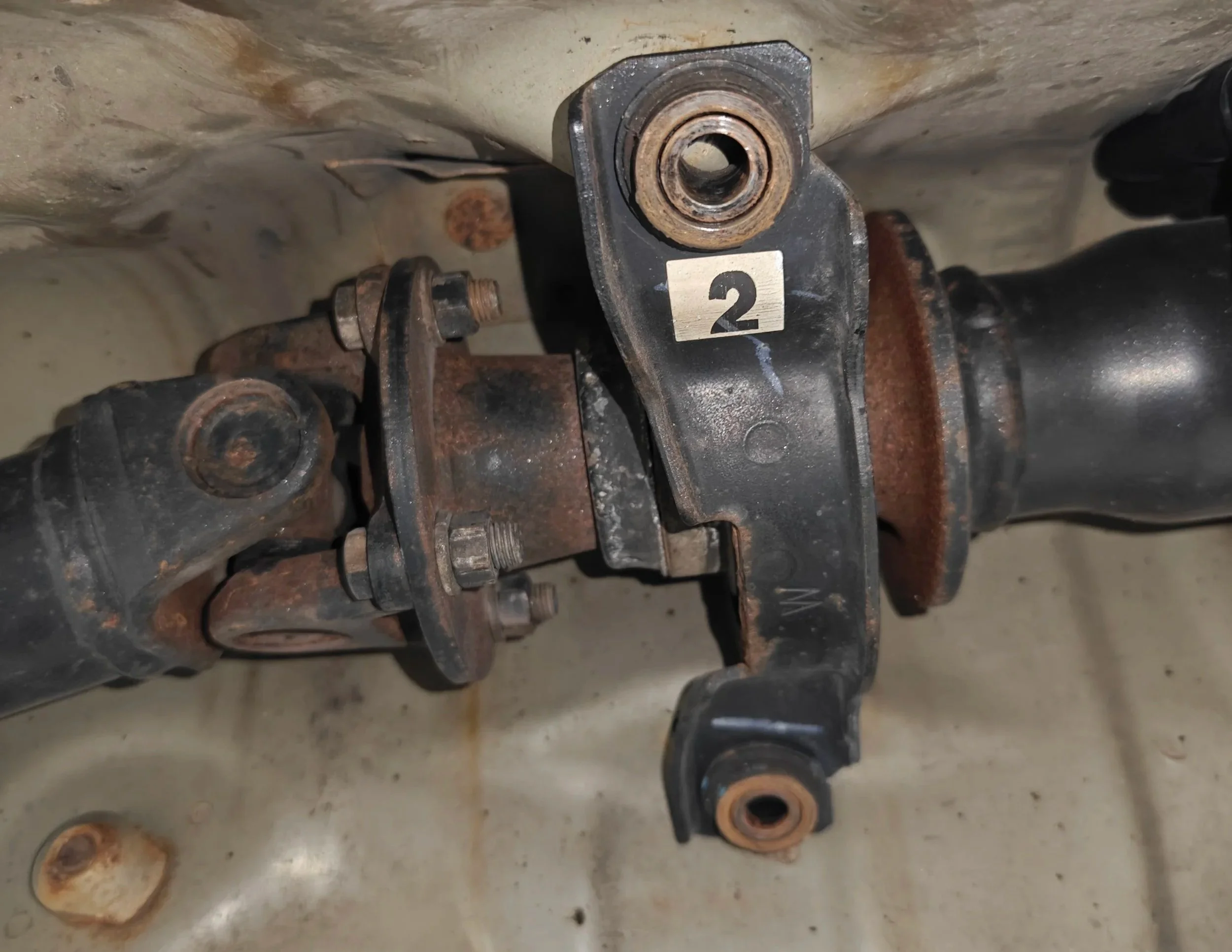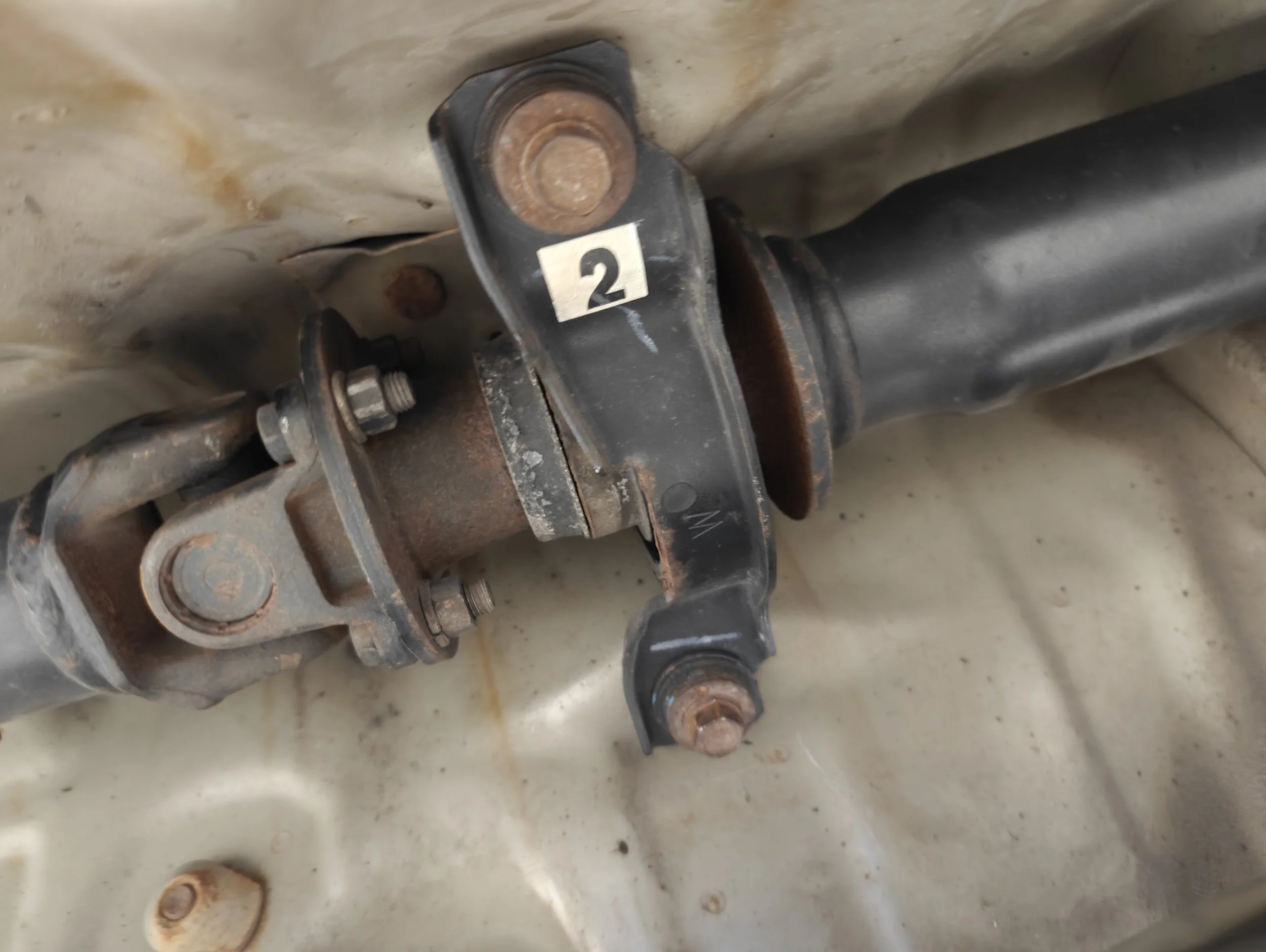 We can move on to the middle of the driveshaft to remove the two bolts that support the center driveshaft bearing. Again be aware that removal these bolts will free another portion of the driveshaft which will try and fall on you.
