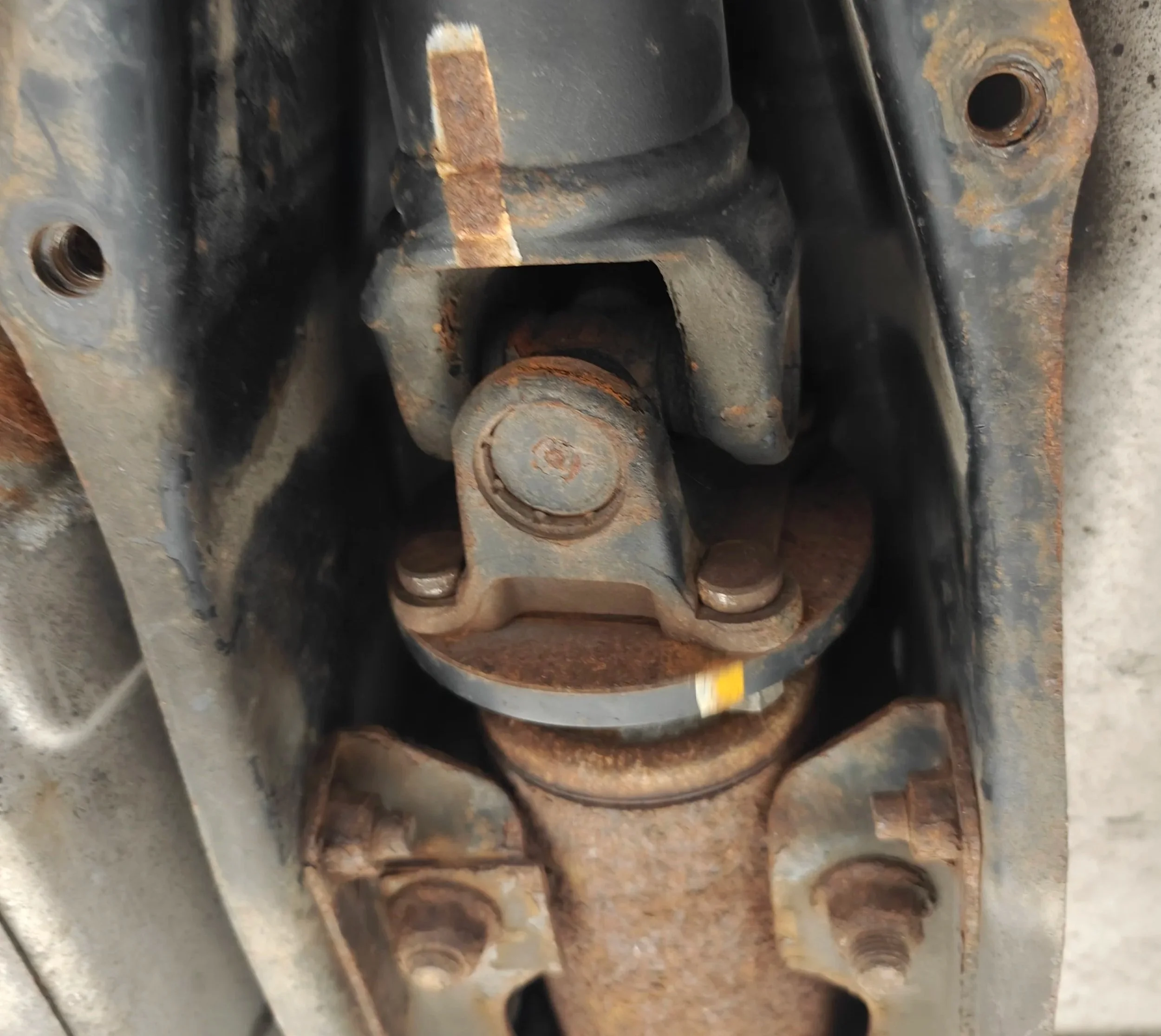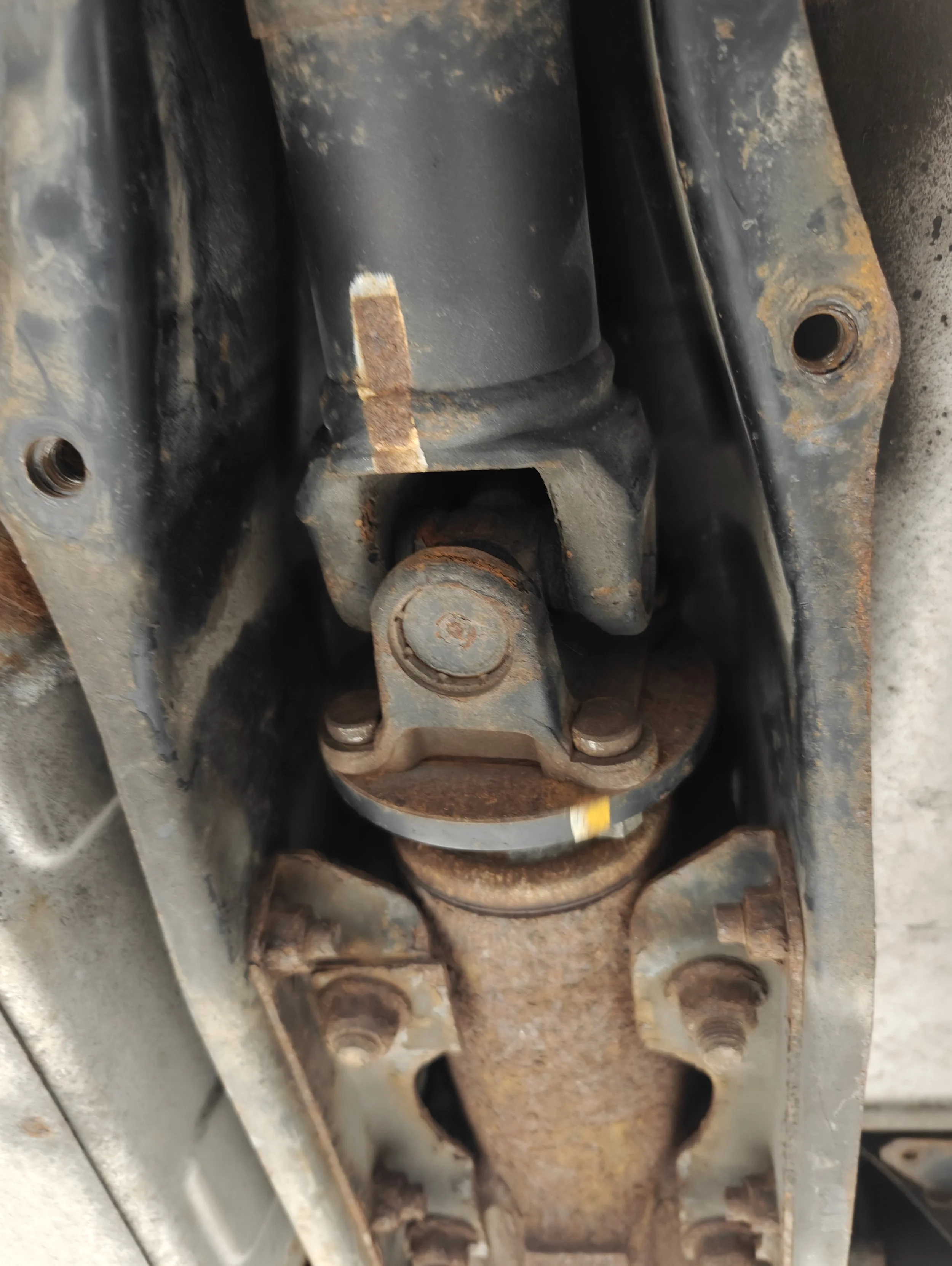 The next bolts on the list are in the middle here. You could also split the driveshaft in half if that helps make life easier.