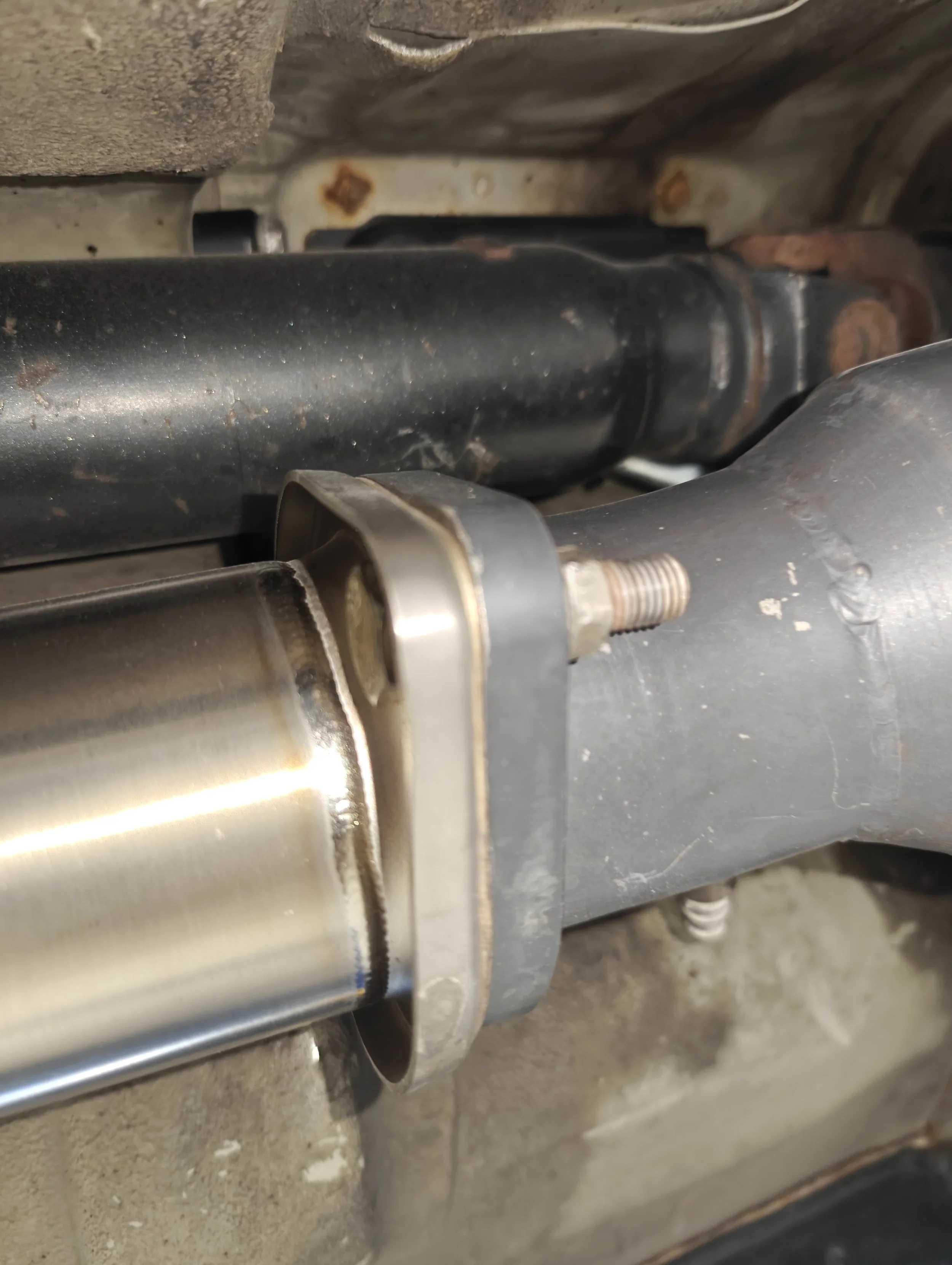 A single clamp holds my Cobb Ti exhaust mid-pipe to the rear muffler piping.